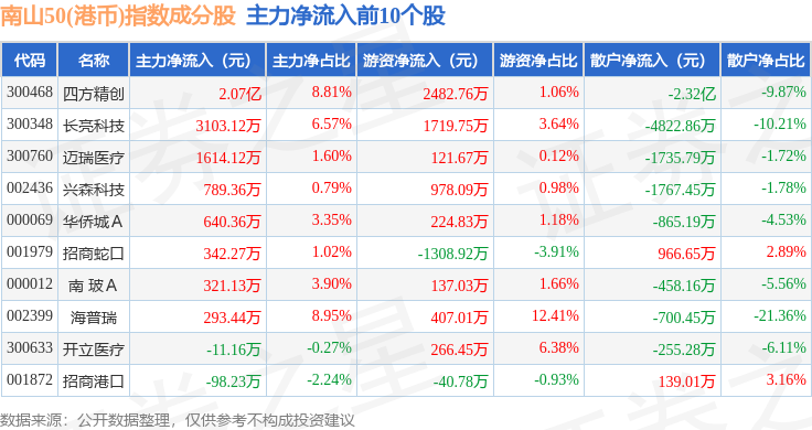 资金流向方面,南山50(港币)(980024)指数成份股当日主力资金净流出合计24.58亿元,游资资金净流入合计5268.34万元,散户资金净流入合计24.06亿元。成份股资金流向详情见下表: