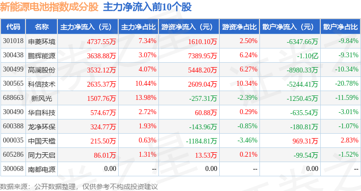 资金流向方面,新能源电池(980027)指数成份股当日主力资金净流出合计39.13亿元,游资资金净流入合计5.37亿元,散户资金净流入合计33.76亿元。成份股资金流向详情见下表: