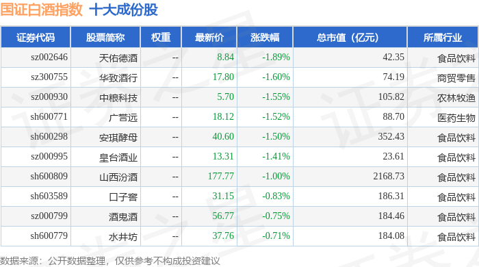 证券之星消息,12月16日,国证白酒(980031)指数报收于64959.13点,跌0.26%,成交98.93亿元,换手率0.66%。当日该指数成份股中,上涨的有7家,豫园股份以1.38%的涨幅领涨,下跌的有19家,天佑德酒以1.89%的跌幅领跌。