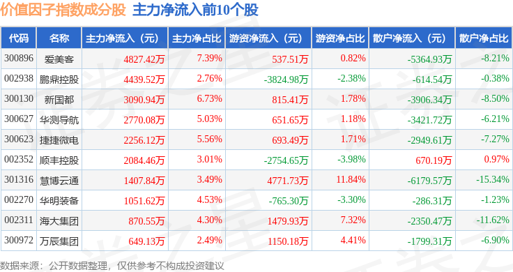 资金流向方面,价值因子(980056)指数成份股当日主力资金净流出合计16.65亿元,游资资金净流出合计955.14万元,散户资金净流入合计16.75亿元。成份股资金流向详情见下表: