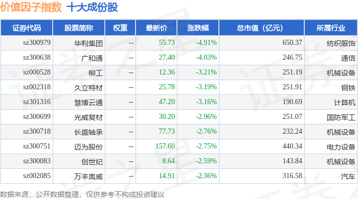 证券之星消息,12月16日,价值因子(980056)指数报收于2595.88点,跌0.81%,成交307.57亿元,换手率0.64%。当日该指数成份股中,上涨的有16家,新国都以2.79%的涨幅领涨,下跌的有33家,华利集团以4.91%的跌幅领跌。