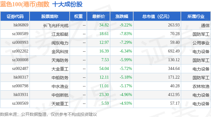 蓝色100(港币)(980069)指数十大成份股详情如下: