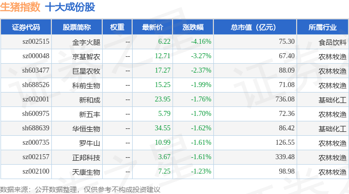 生猪指数(980073)十大成份股详情如下: