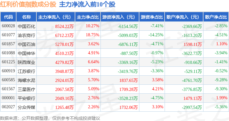 资金流向方面,红利价值(980103)指数成份股当日主力资金净流出合计7.18亿元,游资资金净流入合计1.08亿元,散户资金净流入合计6.1亿元。成份股资金流向详情见下表: