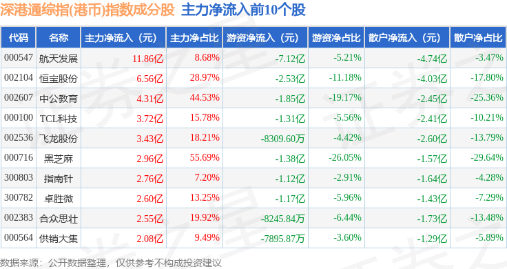 资金流向方面,深港通综指(港币)(983006)指数成份股当日主力资金净流出合计390.6亿元,游资资金净流入合计63.89亿元,散户资金净流入合计326.71亿元。成份股资金流向详情见下表: