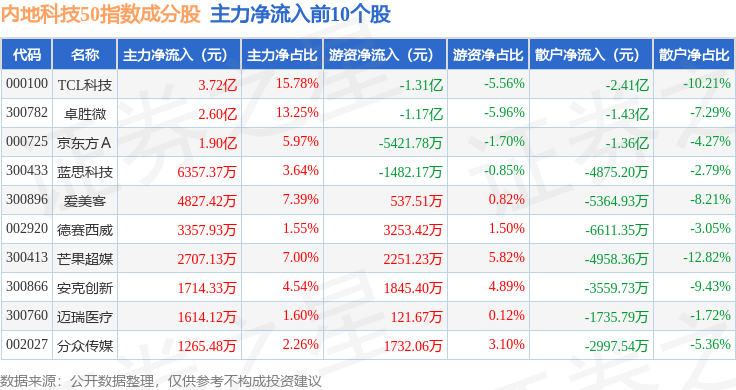 资金流向方面,内地科技50(983003)指数成份股当日主力资金净流出合计33.58亿元,游资资金净流入合计5.41亿元,散户资金净流入合计28.17亿元。成份股资金流向详情见下表: