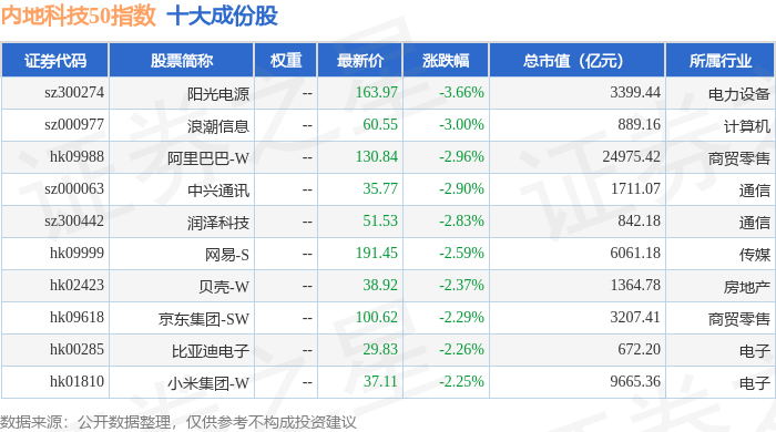 内地科技50(983003)指数十大成份股详情如下: