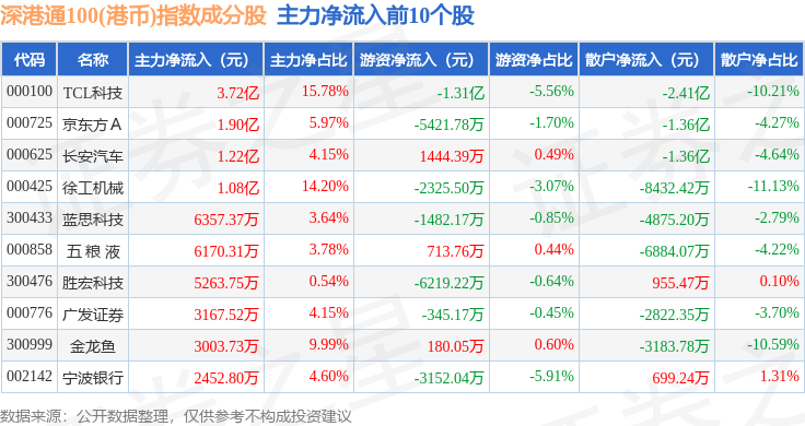 资金流向方面,深港通100(港币)(983008)指数成份股当日主力资金净流出合计73.4亿元,游资资金净流入合计35.51亿元,散户资金净流入合计37.89亿元。成份股资金流向详情见下表: