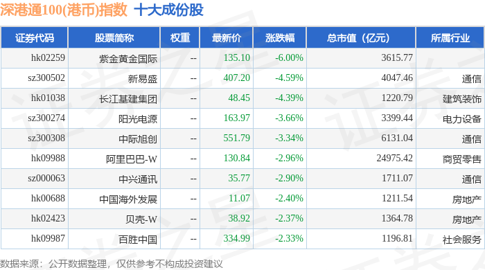 深港通100(港币)(983008)指数十大成份股详情如下: