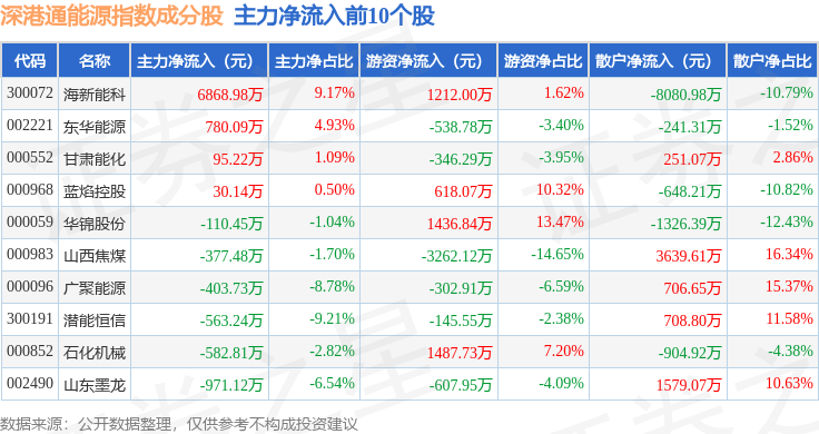 资金流向方面,深港通能源(983013)指数成份股当日主力资金净流出合计3.69亿元,游资资金净流入合计170.13万元,散户资金净流入合计3.67亿元。成份股资金流向详情见下表:
