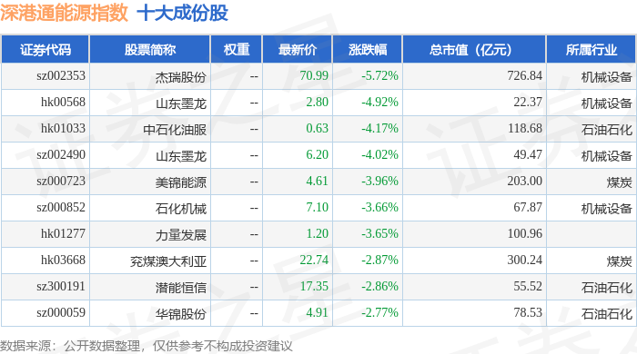 证券之星消息,12月16日,深港通能源(983013)指数报收于6602.66点,跌1.82%,成交83.19亿元,换手率0.5%。当日该指数成份股中,上涨的有2家,海新能科以0.66%的涨幅领涨,下跌的有29家,杰瑞股份以5.72%的跌幅领跌。