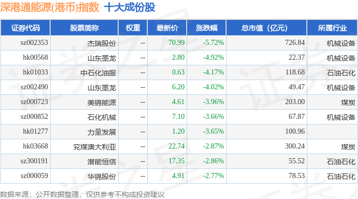 深港通能源(港币)(983014)指数十大成份股详情如下: