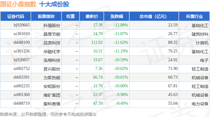 证券之星消息,12月16日,国证小盘(980202)指数报收于1702.94点,跌1.72%,成交1695.25亿元,换手率3.56%。当日该指数成份股中,上涨的有333家,汉鑫科技以29.99%的涨幅领涨,下跌的有1156家,科强股份以12.88%的跌幅领跌。