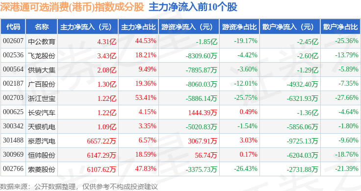 资金流向方面,深港通可选消费(港币)(983020)指数成份股当日主力资金净流出合计21.56亿元,游资资金净流入合计1.97亿元,散户资金净流入合计19.59亿元。成份股资金流向详情见下表: