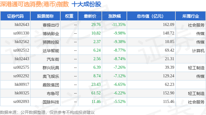 深港通可选消费(港币)(983020)指数十大成份股详情如下: