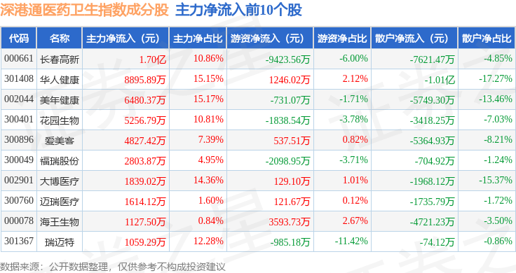 资金流向方面,深港通医药卫生(983023)指数成份股当日主力资金净流出合计20.42亿元,游资资金净流入合计2.56亿元,散户资金净流入合计17.85亿元。成份股资金流向详情见下表: