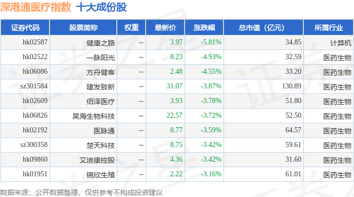 证券之星消息,12月16日,深港通医疗(983035)指数报收于4340.85点,跌0.58%,成交71.81亿元,换手率0.81%。当日该指数成份股中,上涨的有17家,福瑞股份以4.6%的涨幅领涨,下跌的有41家,健康之路以5.81%的跌幅领跌。