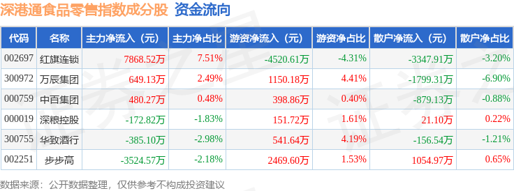 资金流向方面,深港通食品零售(983037)指数成份股当日主力资金净流入合计4915.43万元,游资资金净流入合计191.39万元,散户资金净流出合计5106.82万元。成份股资金流向详情见下表: