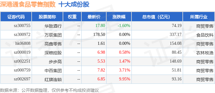 证券之星消息,12月16日,深港通食品零售(983037)指数报收于2421.74点,涨2.3%,成交41.85亿元,换手率4.22%。当日该指数成份股中,上涨的有4家,红旗连锁以9.95%的涨幅领涨,下跌的有1家,华致酒行以1.6%的跌幅领跌。