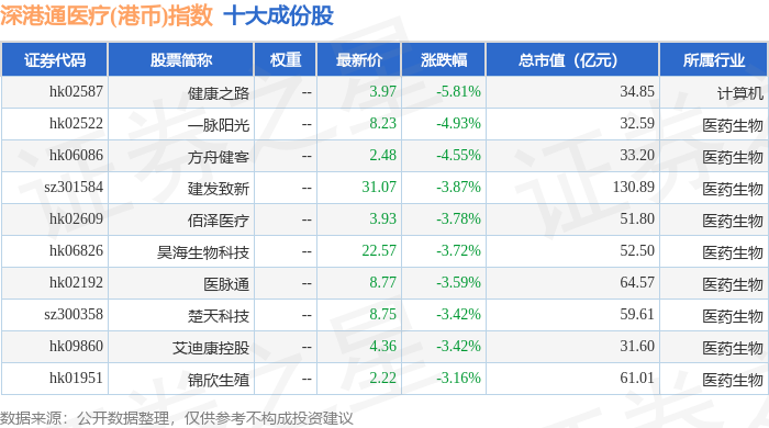 深港通医疗(港币)(983036)指数十大成份股详情如下: