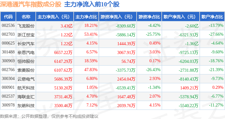 资金流向方面,深港通汽车(983039)指数成份股当日主力资金净流出合计4.63亿元,游资资金净流出合计4474.27万元,散户资金净流入合计5.08亿元。成份股资金流向详情见下表:
