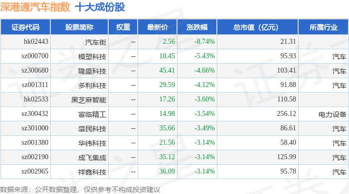 证券之星消息,12月16日,深港通汽车(983039)指数报收于7521.02点,跌1.13%,成交432.09亿元,换手率2.13%。当日该指数成份股中,上涨的有26家,浙江世宝以12.9%的涨幅领涨,下跌的有67家,汽车街以8.74%的跌幅领跌。
