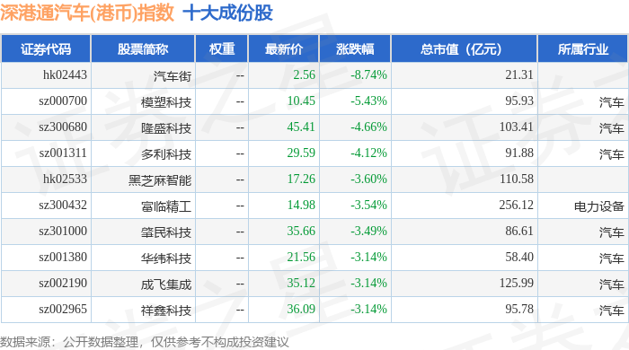 深港通汽车(港币)(983040)指数十大成份股详情如下: