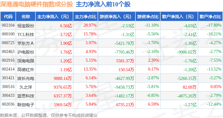 资金流向方面,深港通电脑硬件(983043)指数成份股当日主力资金净流出合计47.29亿元,游资资金净流入合计6.41亿元,散户资金净流入合计40.88亿元。成份股资金流向详情见下表: