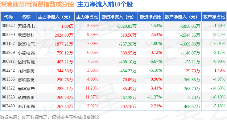 资金流向方面,深港通耐用消费(983049)指数成份股当日主力资金净流出合计6.69亿元,游资资金净流入合计1.99亿元,散户资金净流入合计4.7亿元。成份股资金流向详情见下表: