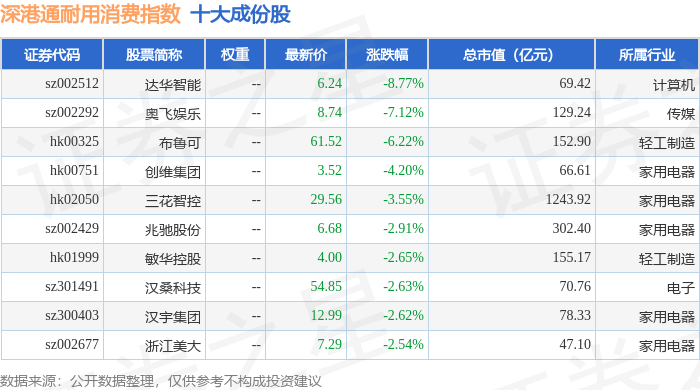 深港通耐用消费(983049)指数十大成份股详情如下: