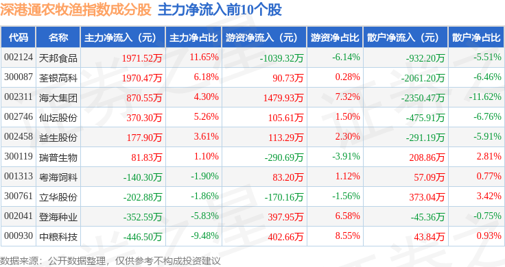 资金流向方面,深港通农牧渔(983051)指数成份股当日主力资金净流出合计5.11亿元,游资资金净流入合计2303.8万元,散户资金净流入合计4.88亿元。成份股资金流向详情见下表: