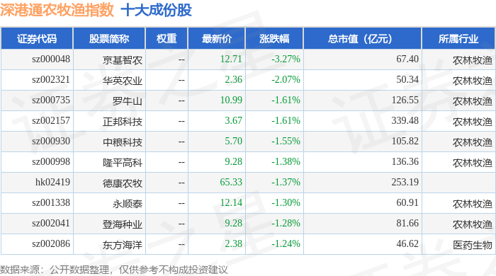 深港通农牧渔(983051)指数十大成份股详情如下: