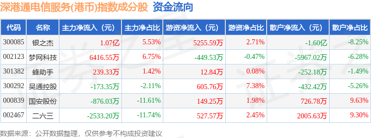 资金流向方面,深港通电信服务(港币)(983058)指数成份股当日主力资金净流入合计1.38亿元,游资资金净流入合计6101.48万元,散户资金净流出合计1.99亿元。成份股资金流向详情见下表: