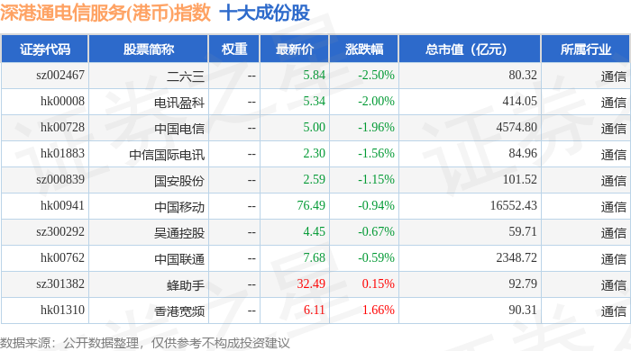 深港通电信服务(港币)(983058)指数十大成份股详情如下: