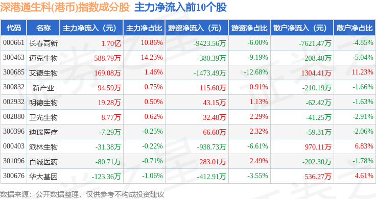 资金流向方面,深港通生科(港币)(983060)指数成份股当日主力资金净流出合计2.74亿元,游资资金净流出合计1.57亿元,散户资金净流入合计4.31亿元。成份股资金流向详情见下表: