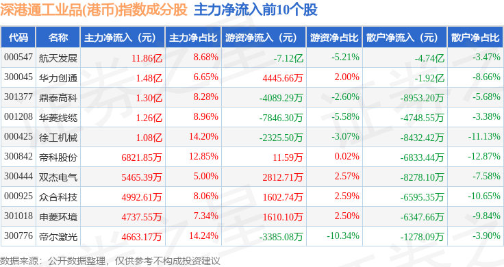 资金流向方面,深港通工业品(港币)(983070)指数成份股当日主力资金净流出合计122.03亿元,游资资金净流入合计8641.51万元,散户资金净流入合计121.17亿元。成份股资金流向详情见下表: