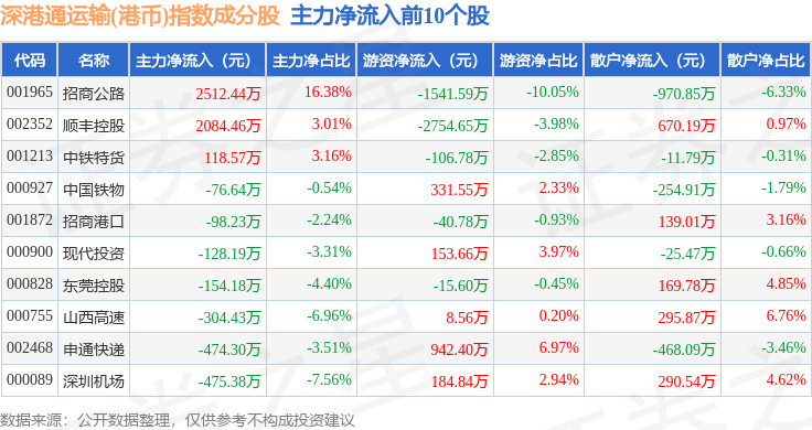 资金流向方面,深港通运输(港币)(983078)指数成份股当日主力资金净流出合计3.68亿元,游资资金净流入合计2094.2万元,散户资金净流入合计3.48亿元。成份股资金流向详情见下表: