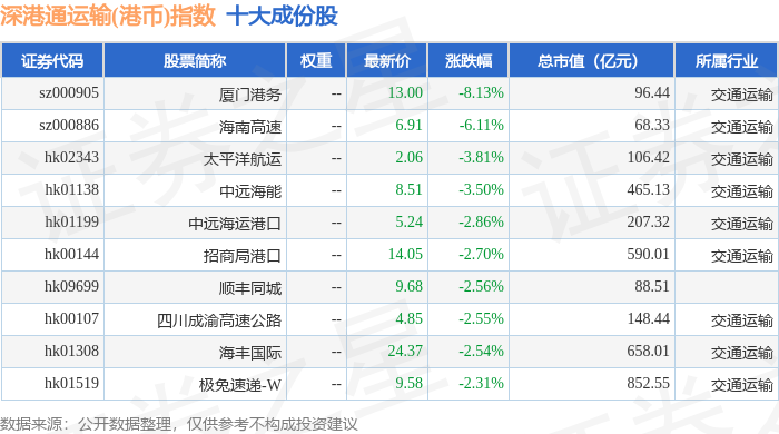 深港通运输(港币)(983078)指数十大成份股详情如下: