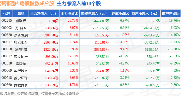 资金流向方面,深港通内房股(983083)指数成份股当日主力资金净流入合计1.4亿元,游资资金净流入合计3542.45万元,散户资金净流出合计1.75亿元。成份股资金流向详情见下表: