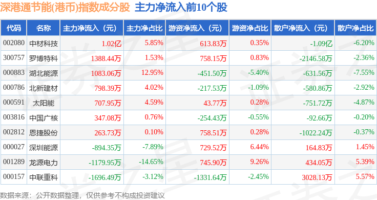 资金流向方面,深港通节能(港币)(983086)指数成份股当日主力资金净流出合计54.93亿元,游资资金净流入合计1.33亿元,散户资金净流入合计53.6亿元。成份股资金流向详情见下表: