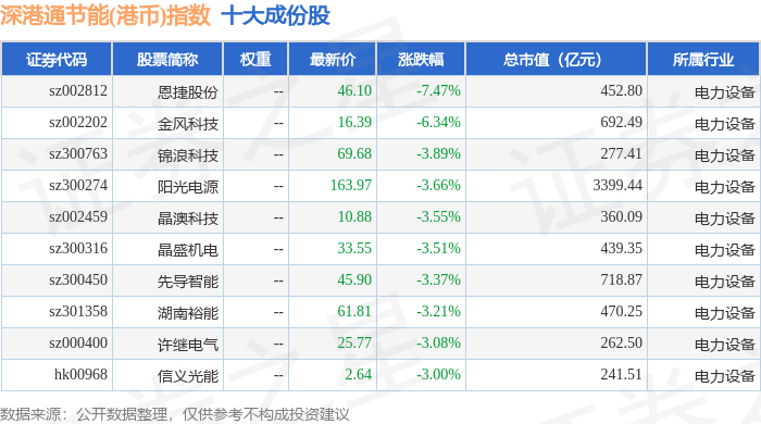 深港通节能(港币)(983086)指数十大成份股详情如下: