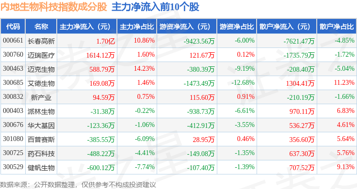 资金流向方面,内地生物科技(983101)指数成份股当日主力资金净流出合计6.19亿元,游资资金净流入合计4868.27万元,散户资金净流入合计5.71亿元。成份股资金流向详情见下表: