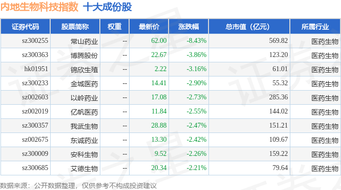 近10日内内地生物科技(983101)指数成份股做了调整,剔除了4只股票。