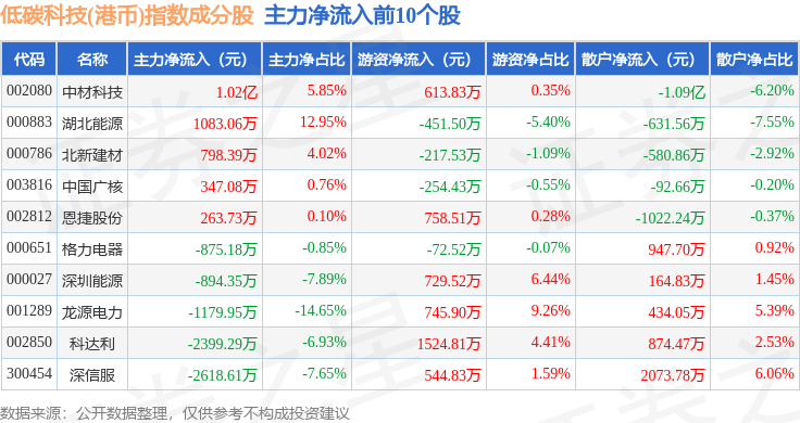资金流向方面,低碳科技(港币)(983161)指数成份股当日主力资金净流出合计59.97亿元,游资资金净流入合计4.22亿元,散户资金净流入合计55.75亿元。成份股资金流向详情见下表: