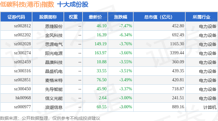 低碳科技(港币)(983161)指数十大成份股详情如下: