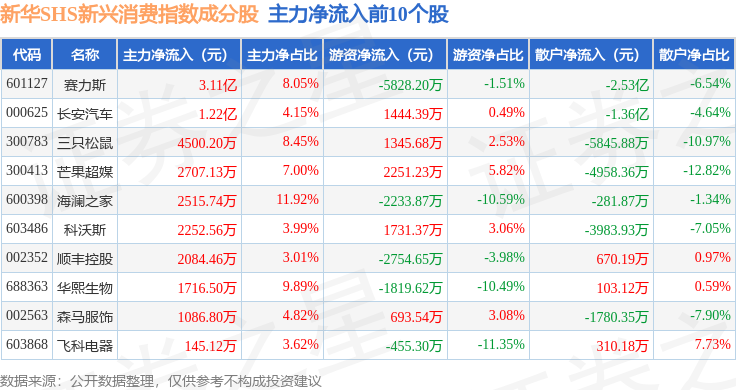 资金流向方面,新华SHS新兴消费(989006)指数成份股当日主力资金净流出合计4.3亿元,游资资金净流入合计1.7亿元,散户资金净流入合计2.6亿元。成份股资金流向详情见下表: