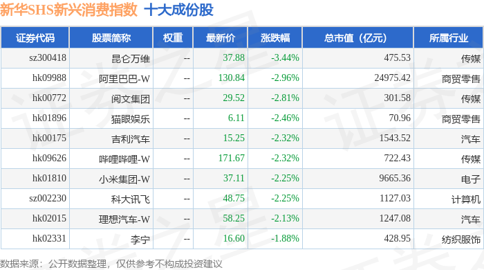 新华SHS新兴消费(989006)指数十大成份股详情如下: