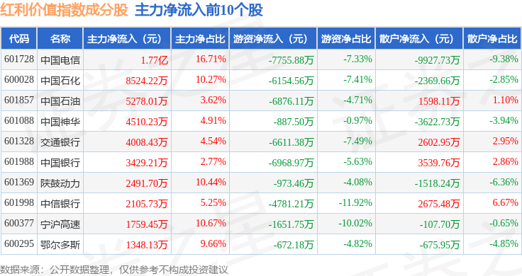 资金流向方面,红利价值(989016)指数成份股当日主力资金净流出合计1.58亿元,游资资金净流出合计1.28亿元,散户资金净流入合计2.86亿元。成份股资金流向详情见下表: