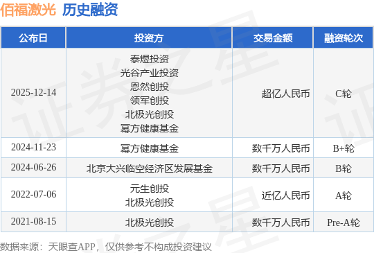 证券之星消息,根据天眼查APP于12月14日公布的信息整理,苏州佰福激光技术有限公司C轮融资,融资额超亿人民币,参与投资的机构包括泰煜投资,光谷产业投资,恩然创投,领军创投,北极光创投,幂方健康基金。