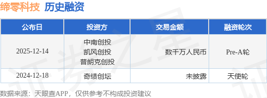 证券之星消息,根据天眼查APP于12月14日公布的信息整理,缔零智源科技(深圳)有限公司Pre-A轮融资,融资额数千万人民币,参与投资的机构包括中南创投,凯风创投,普朗克创投。